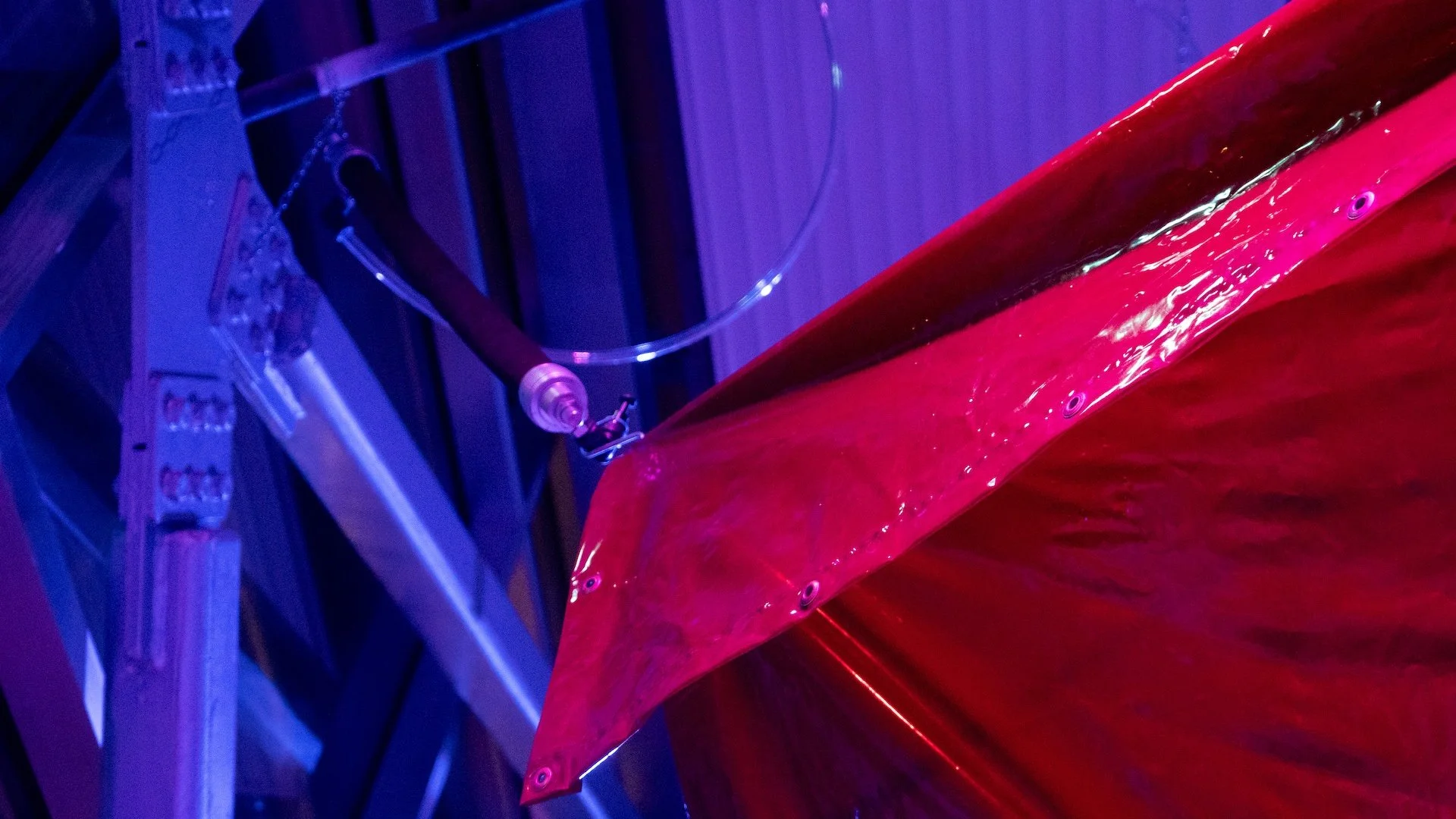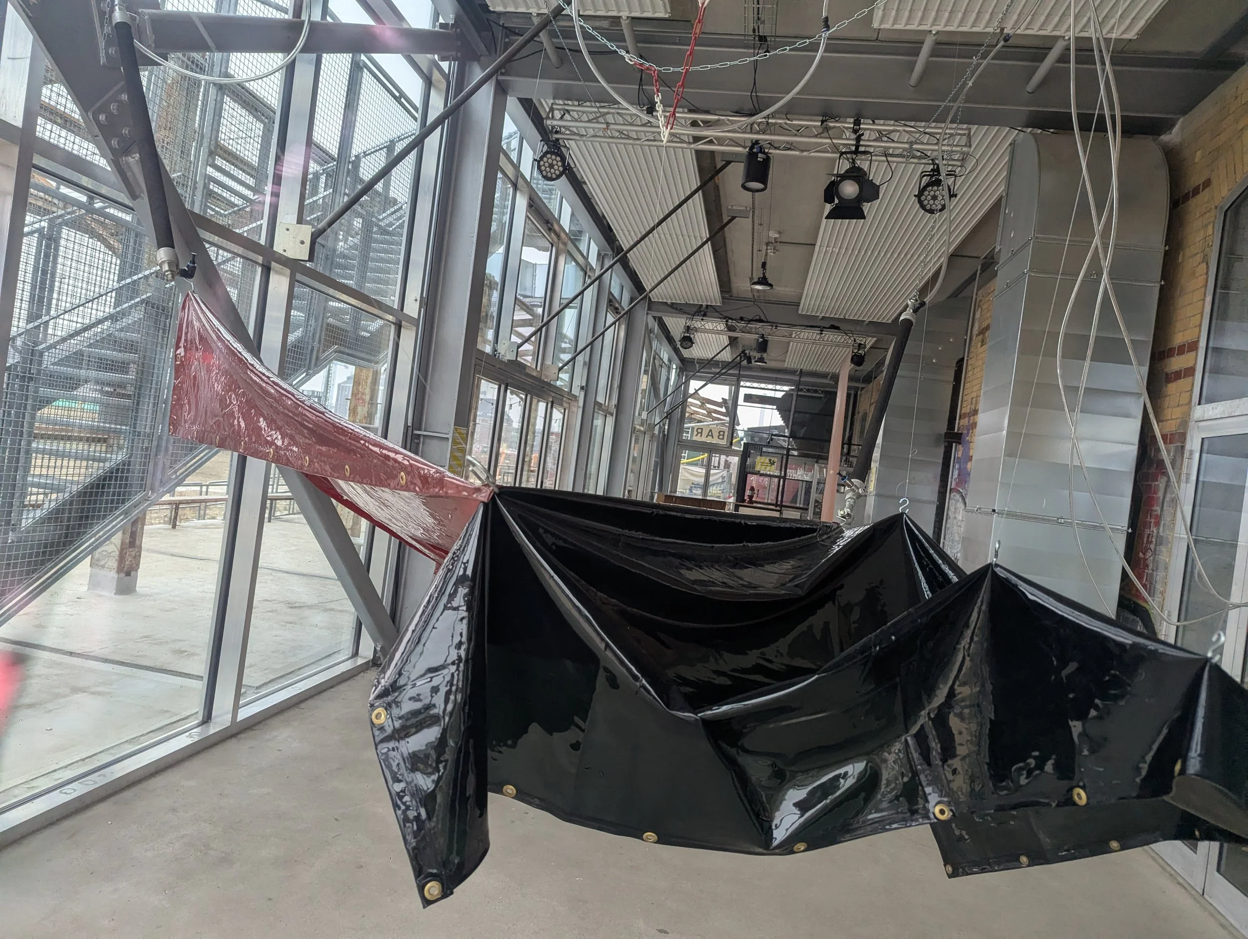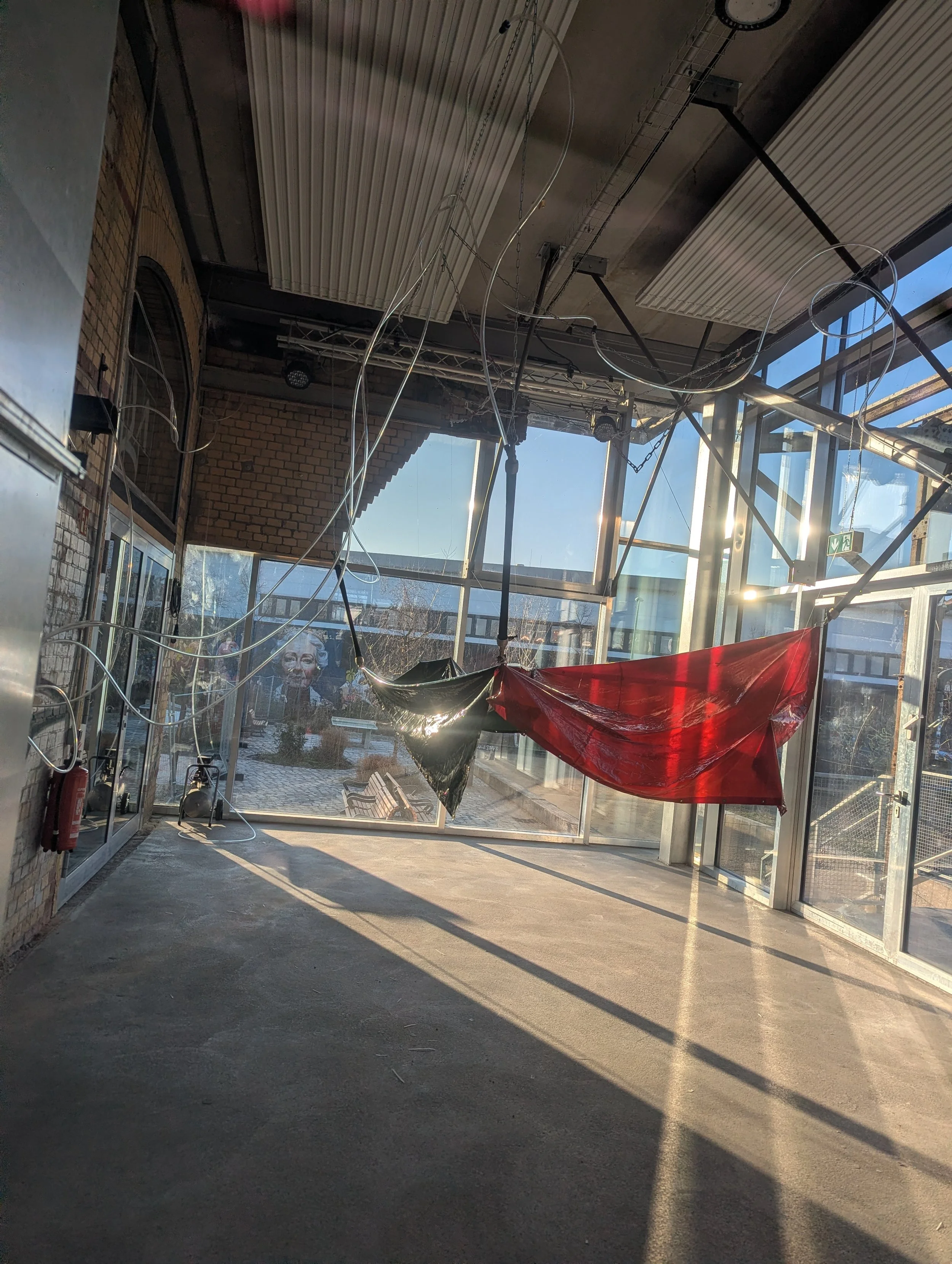 two welding screens hang suspended in geometric space, actuated by FESTO robotic pneumatic muscles in a push- pull. the form is evocative of the iterative optimisation processes of searching the non-euclidean parameter space in machine learning / neural network algorithm tuning. wat (why) r we optimizing?